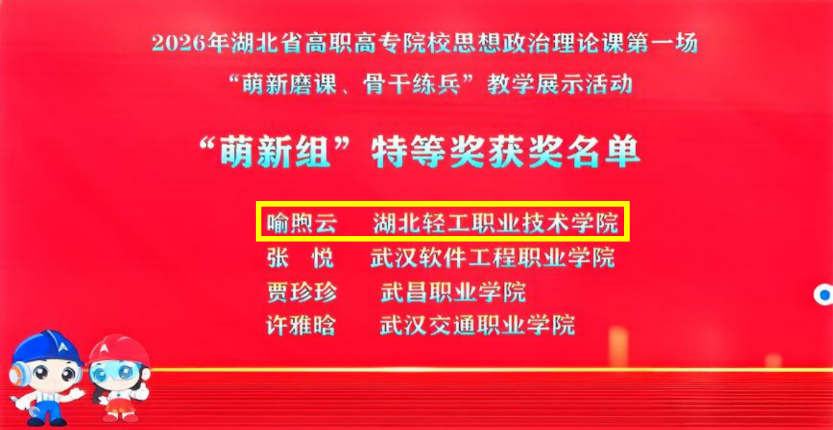 (马克思主义学院讯)近日,2026年第一场全国高职高专院校思政课“萌新磨课、骨干练兵”教学展示活动湖北省初选圆满落幕。湖北轻工职业技术学院马克思主义学院黎玲、喻煦云两位教师凭借过硬的专业素养、创新的教学设计和精彩的现场展示,成功斩获湖北省两项特等奖,以全省前列的优异名次脱颖而出,顺利入选全国总决赛,充分彰显了我校思政课教学的强劲实力。