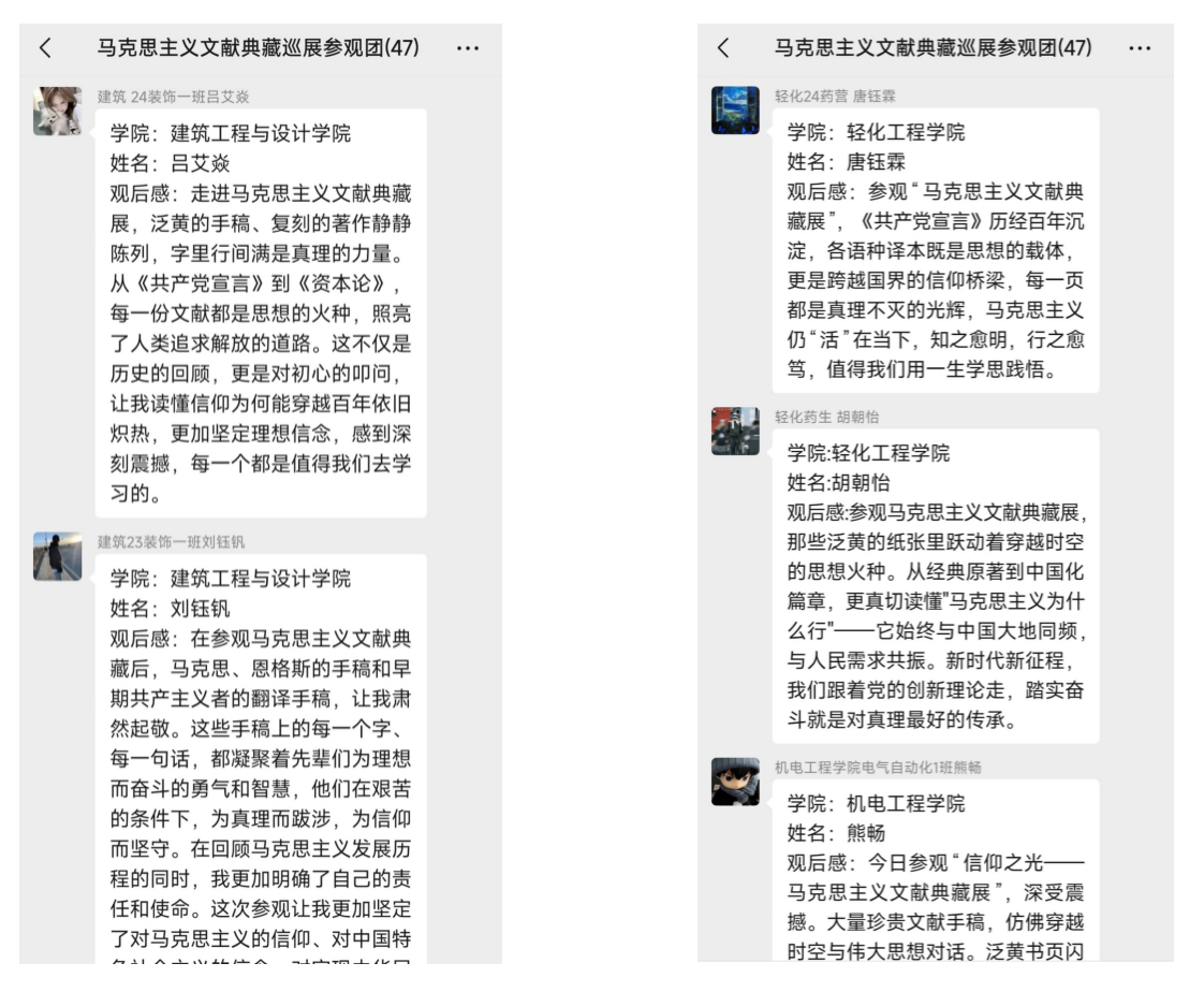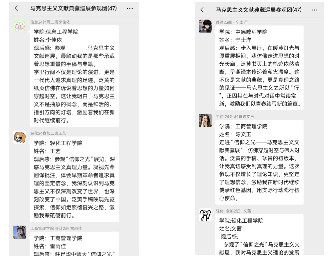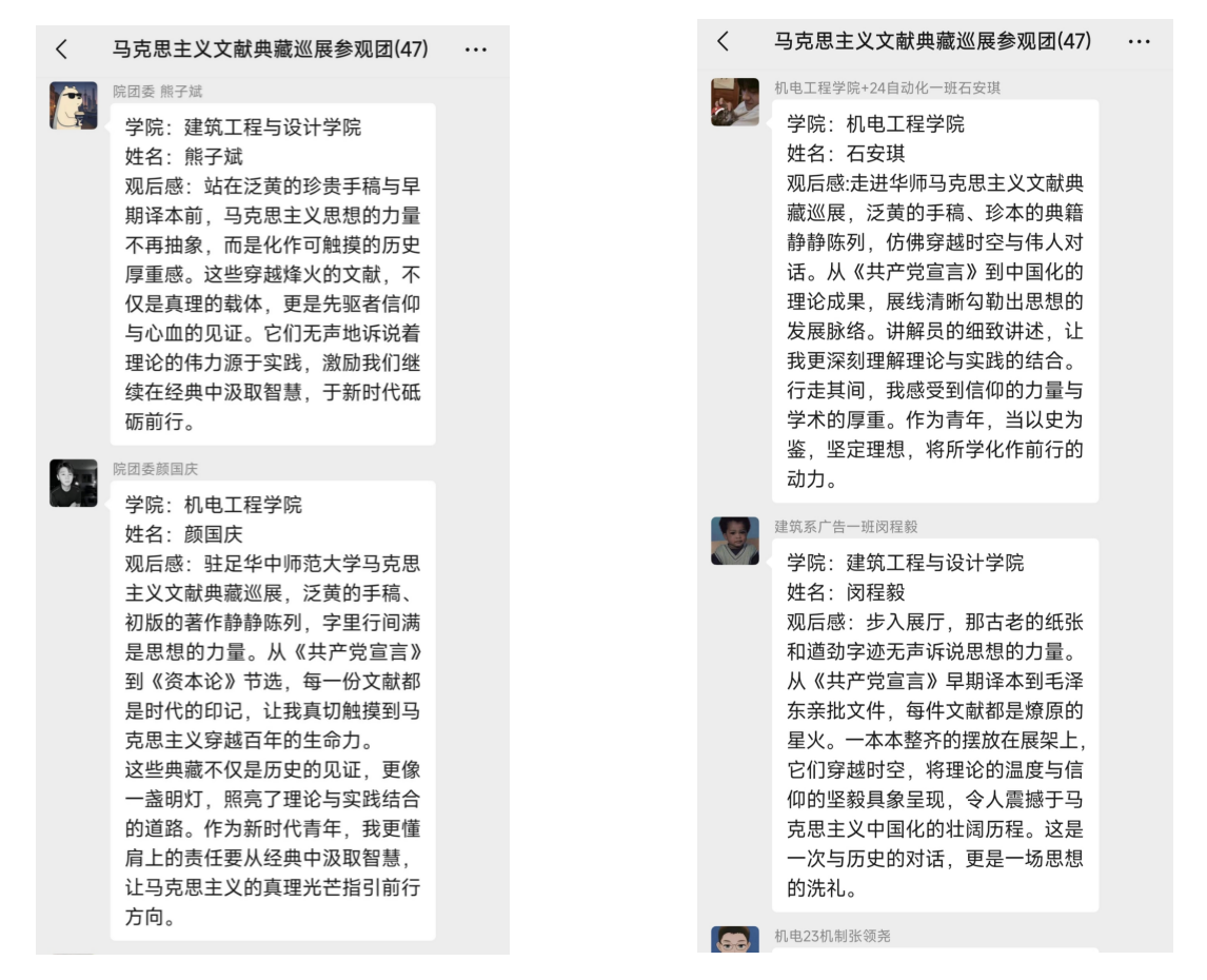 “作为湖北轻工青马班学员,这些文献让我直观看到信仰的传承轨迹。”建筑工程与设计学院学生赵一璇分享感悟时表示,“此次参观让我深刻认识到,青年学习马克思主义不是空谈理论,而是要像先辈那样将思想转化为行动,在专业领域立足岗位、担当作为,做有理想、敢担当的新时代青年。”
