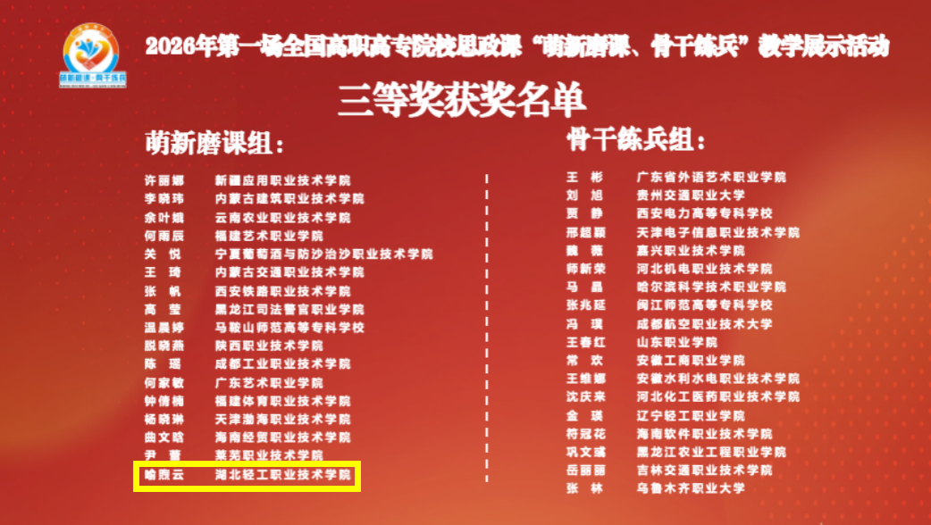 (马克思主义学院讯)4月11日,2026年全国高职高专院校思想政治理论课“萌新磨课、骨干练兵”教学展示活动成功举办,我院喻煦云老师荣获全国三等奖。